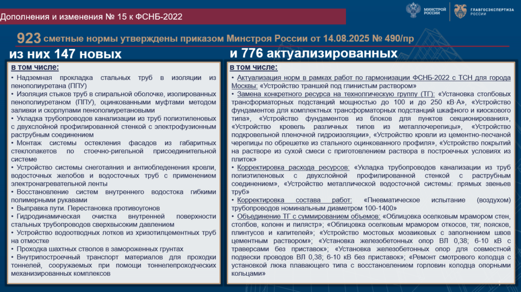 Приказом Минстроя России от 14.08.2025 № 490/пр утверждены дополнения и изменения № 15 к ФСНБ-2022, в состав которых включены в том числе: