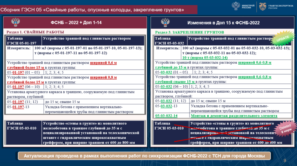 При этом сметные нормы таблицы ГЭСН 05-03-010 «Устройство «стены в грунте» из монолитного железобетона в траншее глубиной до 35 м специализированной установкой на телескопической штанге с гидравлическим широкозахватным грейфером, при ширине траншеи от 600 до 800 мм» исключены.